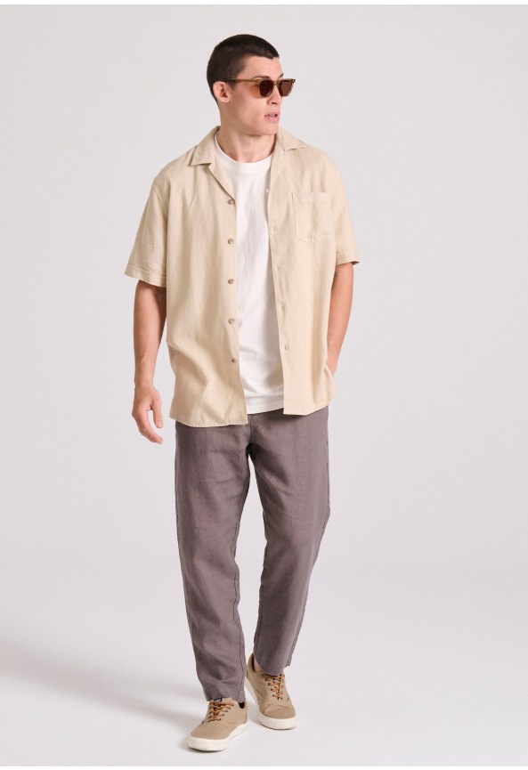Ανακάλυψε την άνεση και το στυλ με το ανδρικό λινό casual chino παντελόνι. Σε regular fit γραμμή και μέση που προσαρμόζεται με λάστιχο, διαθέτει δύο μπροστινές και δύο πίσω τσέπες για επιπλέον λειτουργικότητα. Ο ψηλός καβάλος προσφέρει άνεση, ενώ η ετικέτα με λογότυπο προσθέτει μια διακριτική πινελιά στο στυλ σου.
