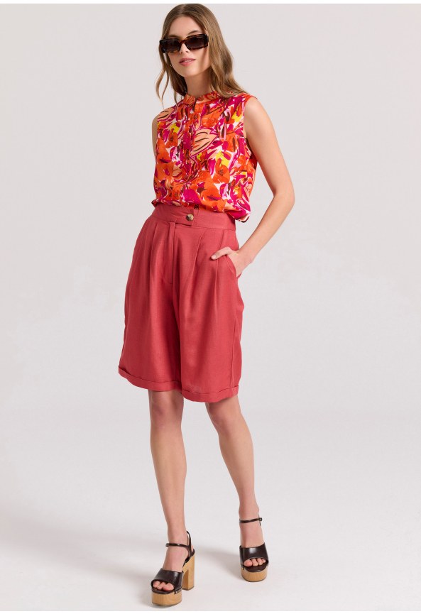 Ανανεωμένη κομψότητα σε κάθε βήμα! Το γυναικείο Linen blend ψηλόμεσο σορτς συνδυάζει άνεση και στυλ με τέλεια αρμονία. Με διπλή πιέτα στη μέση και λεπτομέρεια διπλώματος στο ρεβέρ, αυτό το σορτς αναδεικνύει το στυλ σου. Σε regular fit γραμμή και το κλείσιμο με φερμουάρ και κουμπί εξασφαλίζουν άψογη εφαρμογή και άνεση, ενώ οι τέσσερις τσέπες προσφέρουν λειτουργικότητα και στυλ.